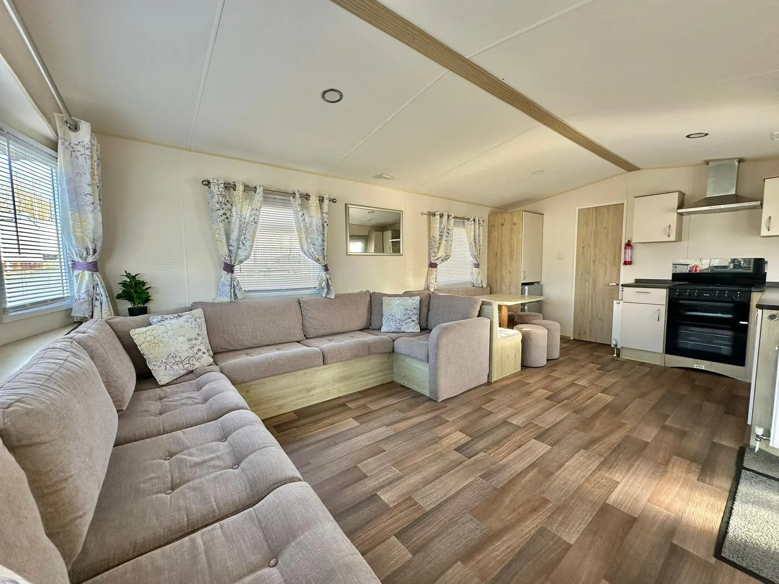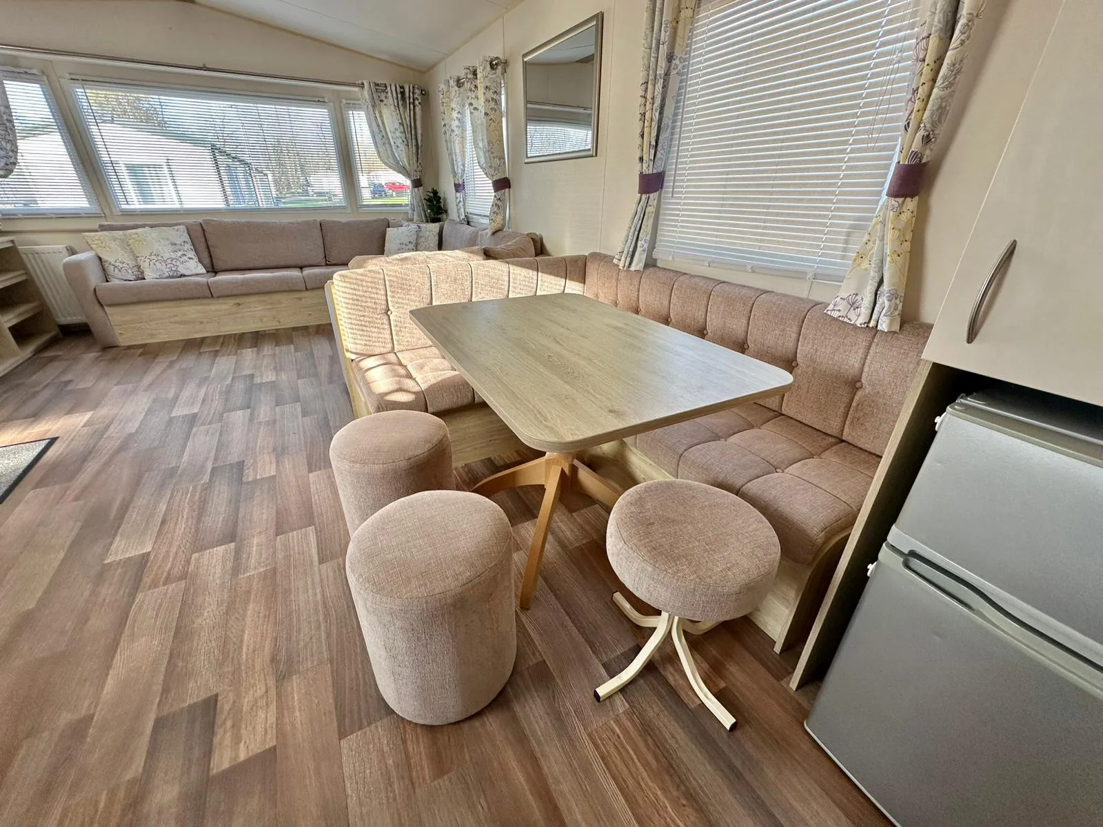 • The ABI Bowland offers a peaceful and spacious holiday home, with its soft, neutral color palette setting a calm, welcoming tone. The open-plan living area features wraparound seating and stylish laminate flooring, creating a sociable and airy space that's perfect for relaxing or entertaining. The booth-style dining area, makes mealtimes a breeze.
