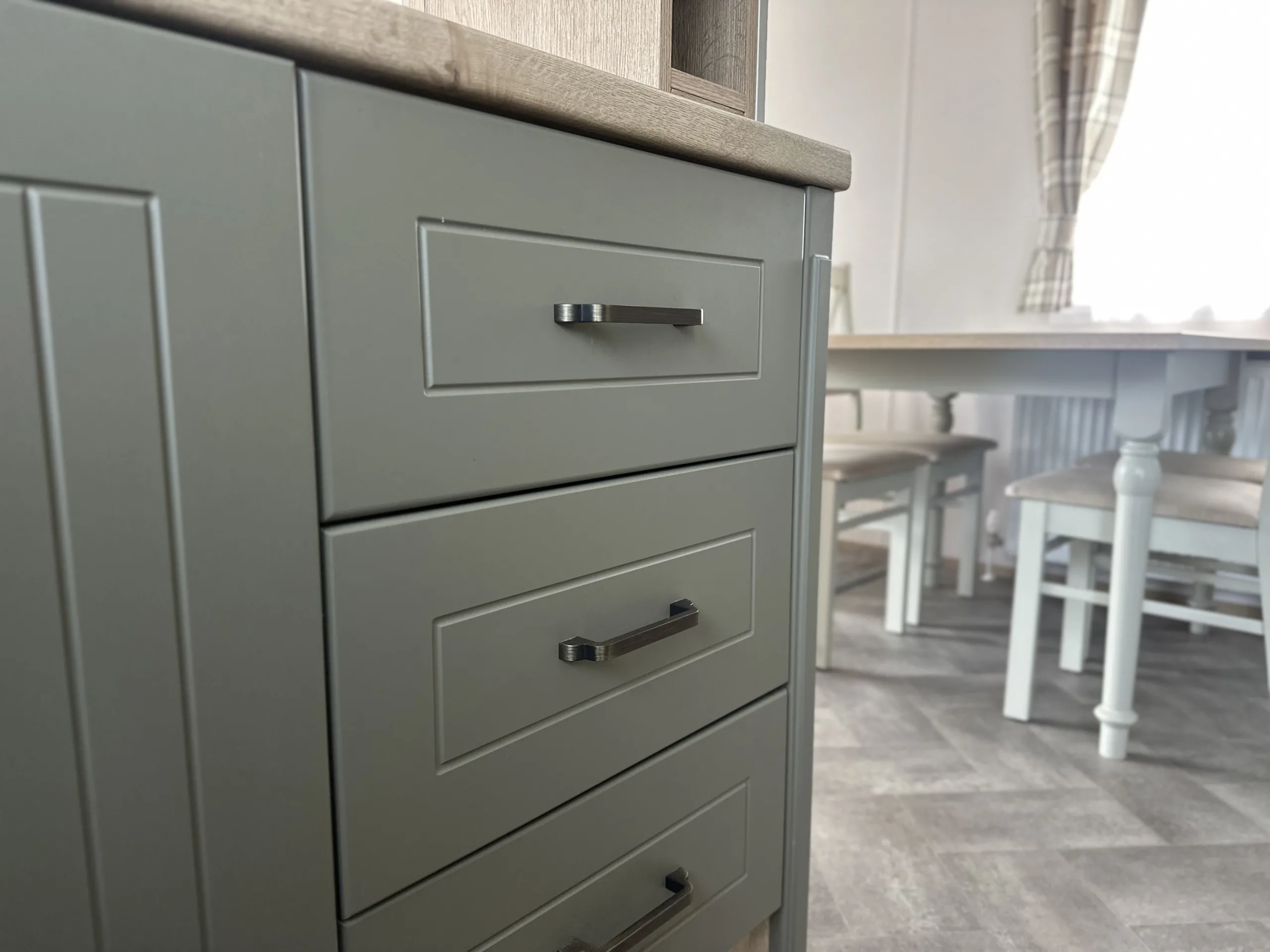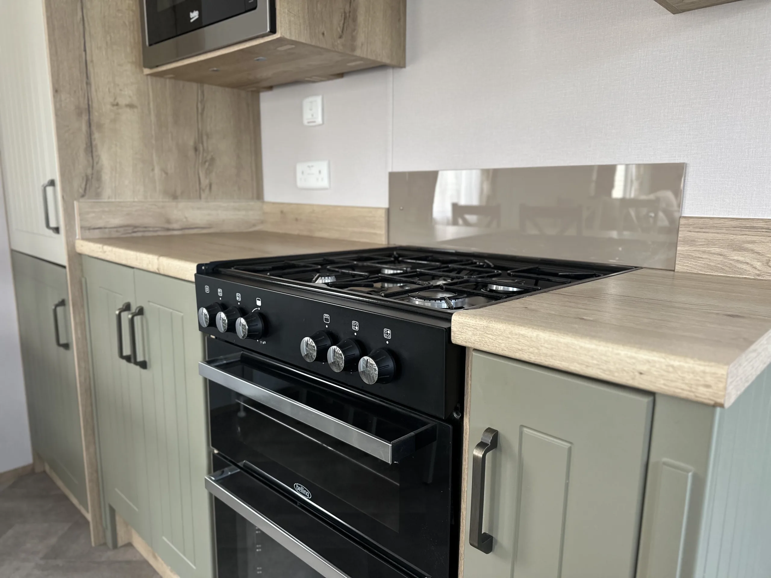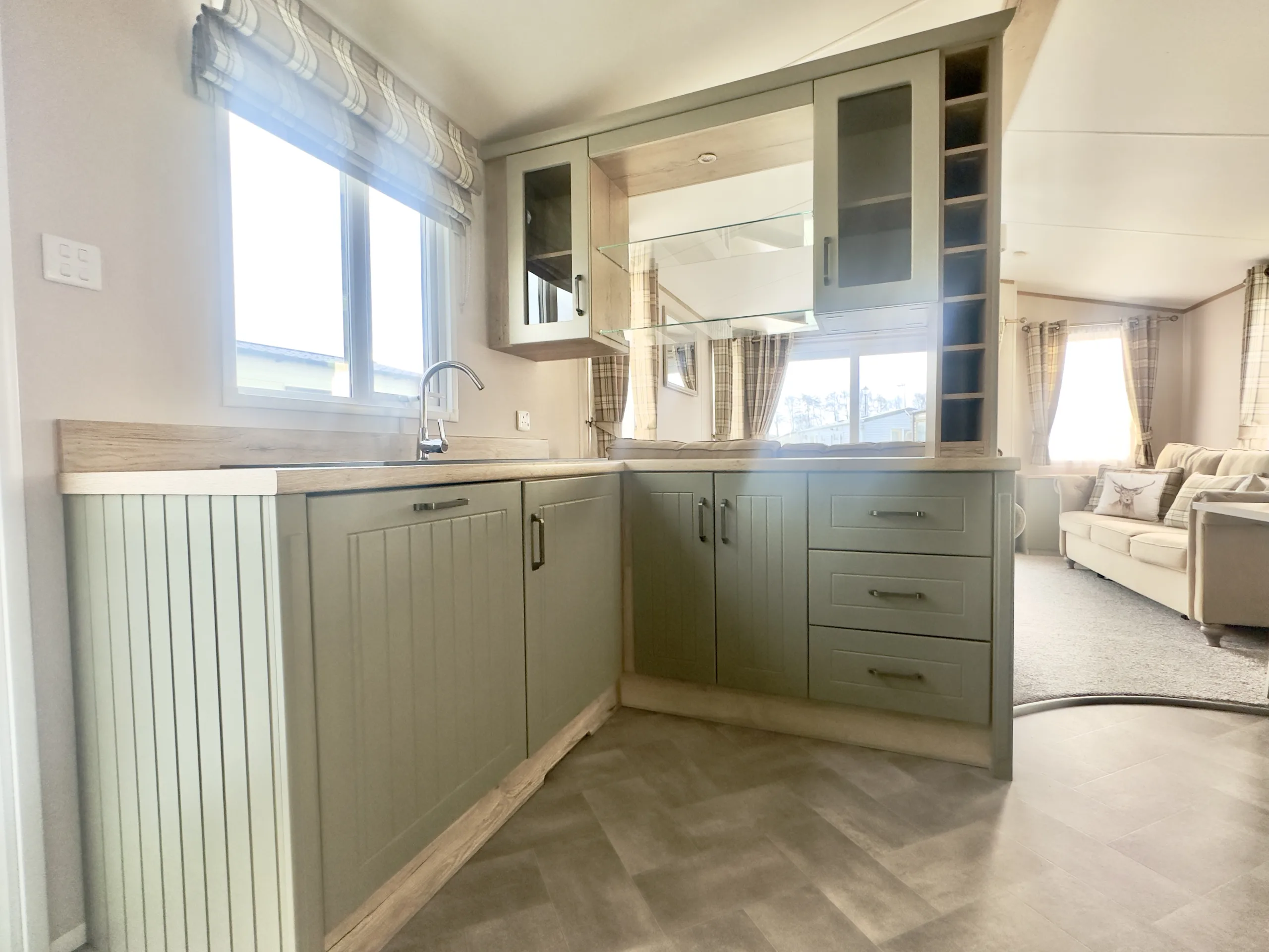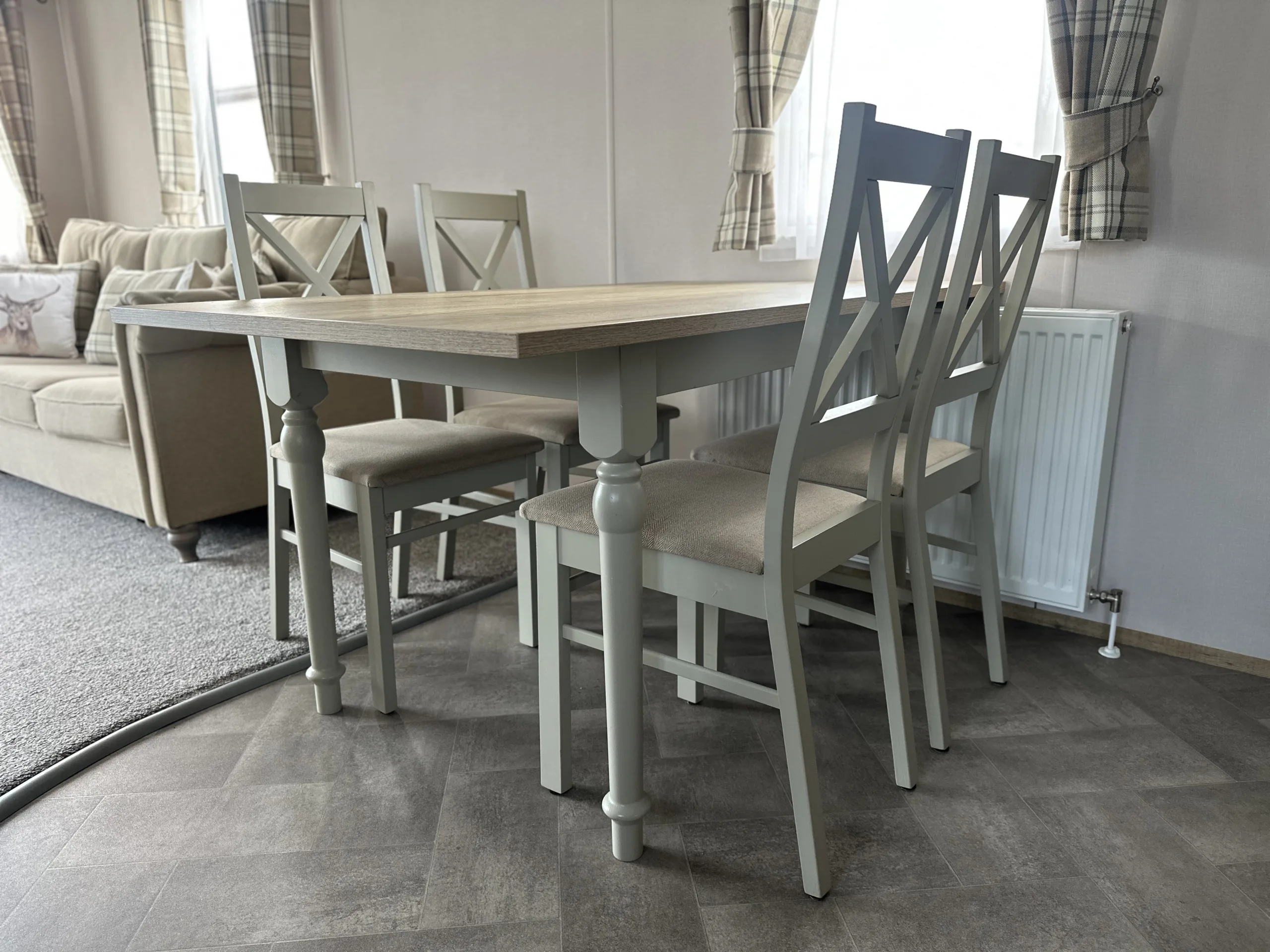 Step inside and you’re welcomed by an open-plan living space filled with natural light, enhanced by front patio doors, double glazing, and gas central heating for those cooler days. The lounge exudes warmth and character, featuring free-standing sofas, a log-burner-style electric fire, and classic country-inspired décor. The farmhouse-style kitchen combines beauty and practicality with its sage and cream cabinetry, integrated fridge-freezer, oven, and 4-burner hob, while a freestanding dining table creates the perfect spot for family meals or entertaining friends.