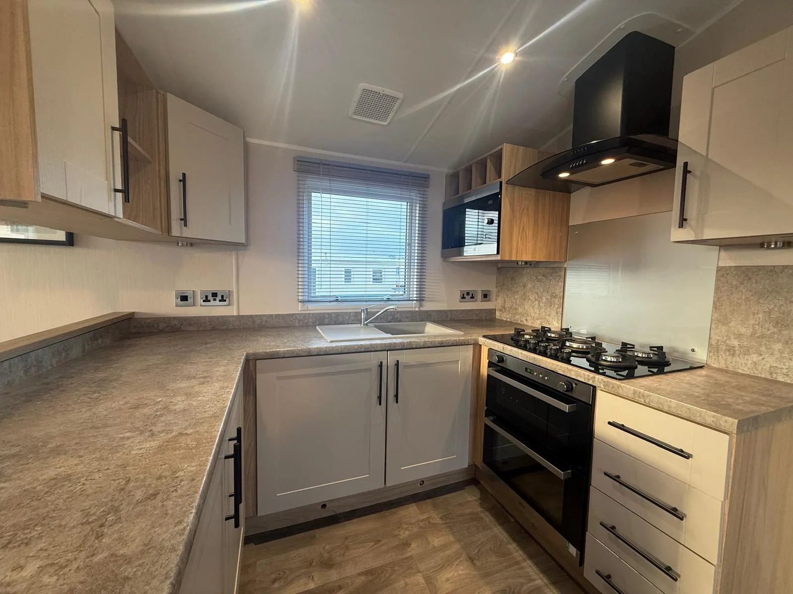 The Manor combines traditional charm with modern comfort, offering a spacious and inviting holiday home. Step into the lounge and sink into the generously sized, freestanding sofas — exceptionally comfortable to capture the best views of the park. One even folds out into a convenient double bed for extra guests. The stylish shaker kitchen is both practical and efficient, with ample worktops, plenty of storage, and under-unit lighting to make cooking effortless. Enjoy meals at the freestanding dining table, perfectly positioned under a large window to fill your space with natural light. In the two-bedroom models, the main bedroom boasts a luxurious king-size bed with clever lift-up storage. You’ll also find a full-size wardrobe, integrated storage solutions, and a vanity unit with mirror — perfect for getting ready for a night out, complete with a convenient en-suite WC.