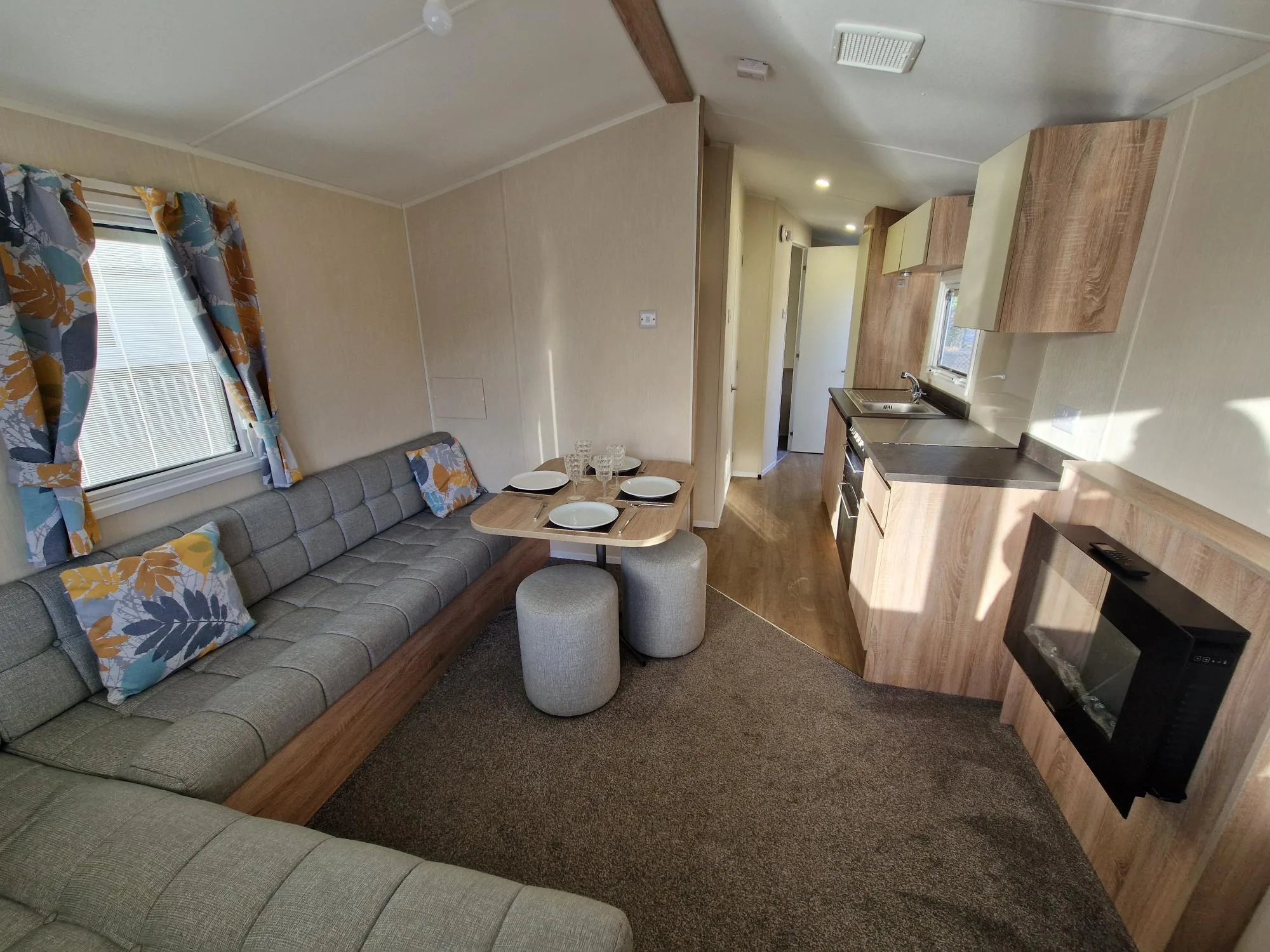 The open-plan living area is bright and inviting, featuring a cosy L-shaped sofa with an electric fire, free-standing TV unit, and a dining area with a 4-seater table. The galley-style kitchen is fully equipped with a gas cooker, hob, and plenty of storage, including space for a fridge/freezer and microwave. The master bedroom is spacious, with an oak-effect headboard, matching bedside units, overhead shelving, and built-in wardrobe space. The twin bedroom offers great storage with a large cupboard and wall-mounted shelves. The family bathroom includes a large walk-in shower, WC, and a vanity unit with under-basin storage. Perfectly presented and packed with clever storage solutions, the Willerby Mistral is a fantastic option for families looking for a holiday home that offers both comfort and convenience. Don't miss out—enquire today!