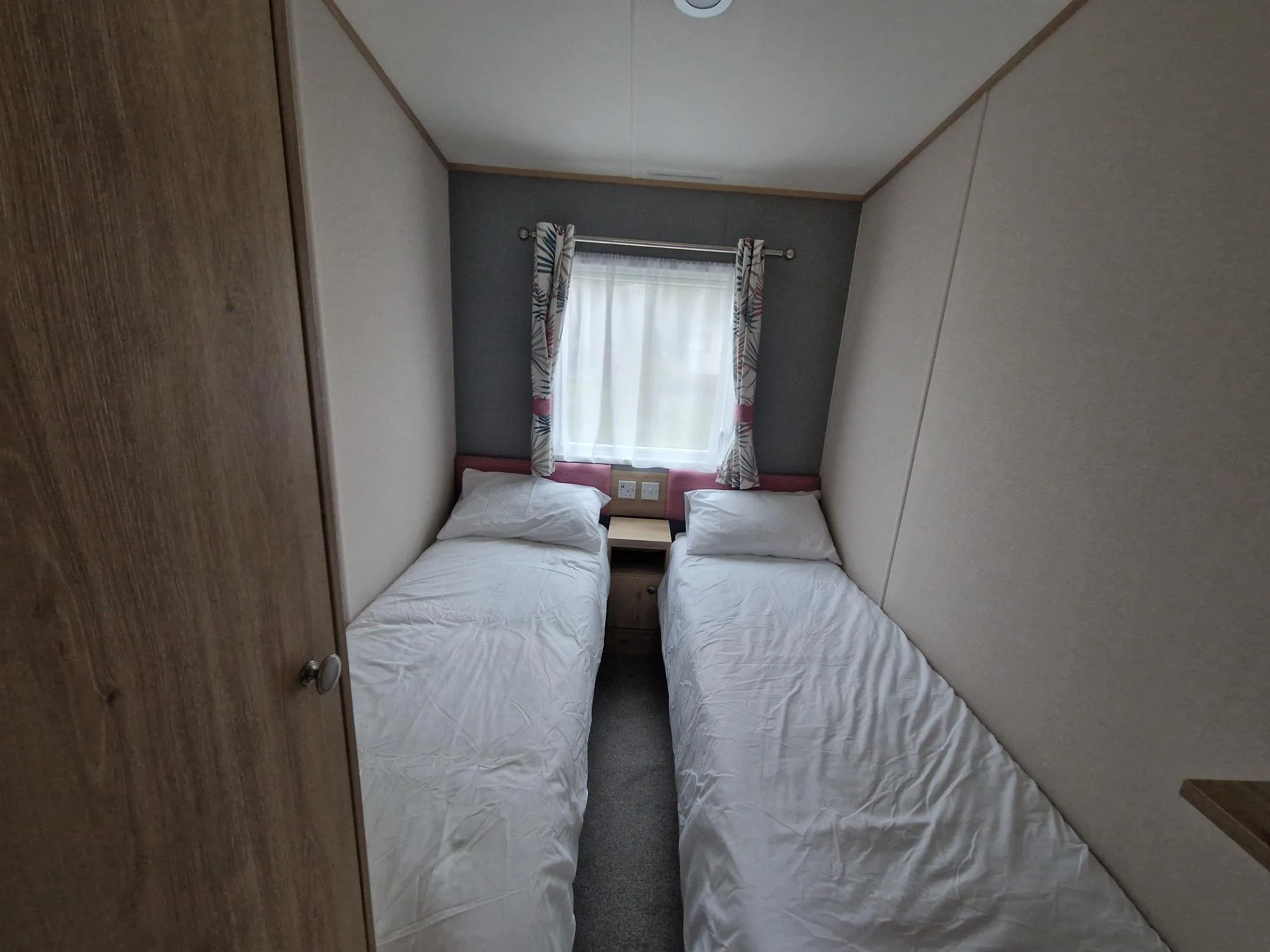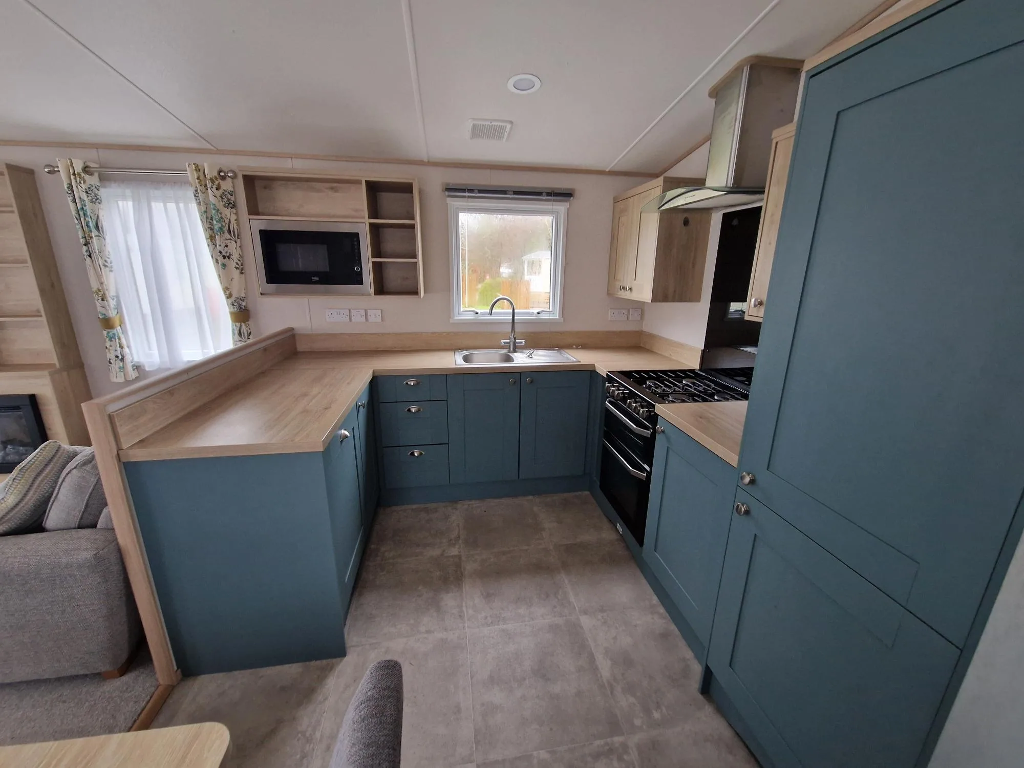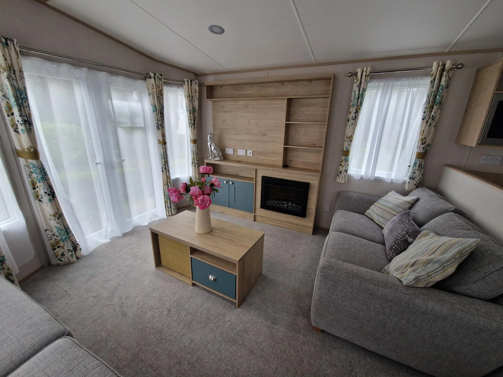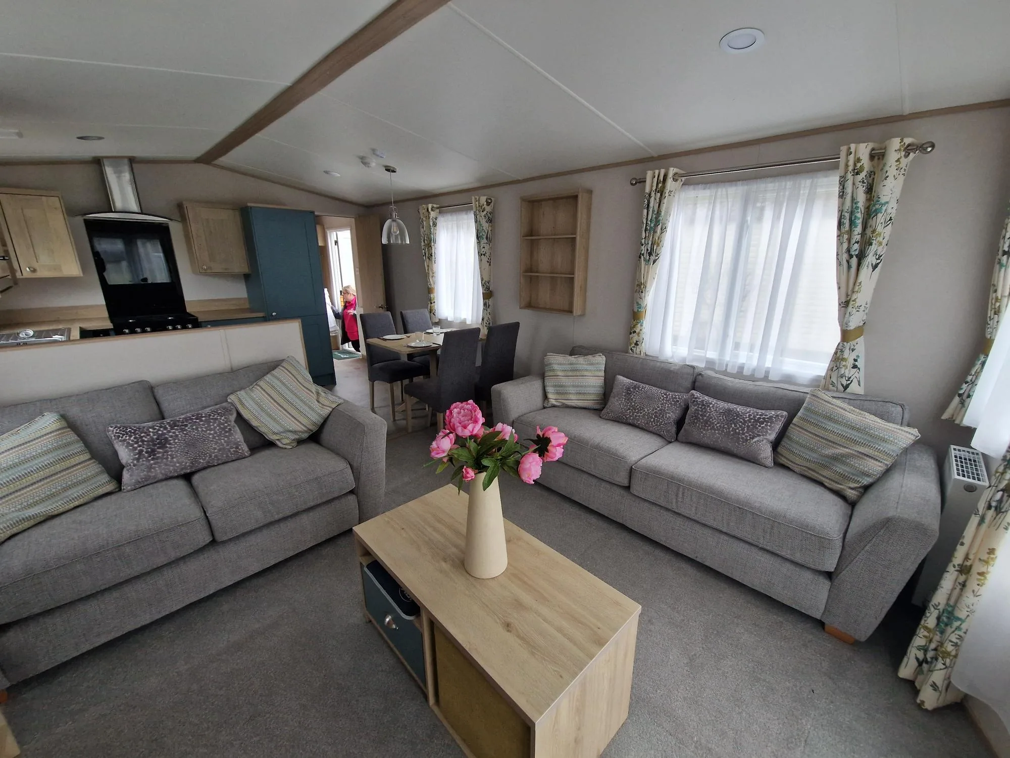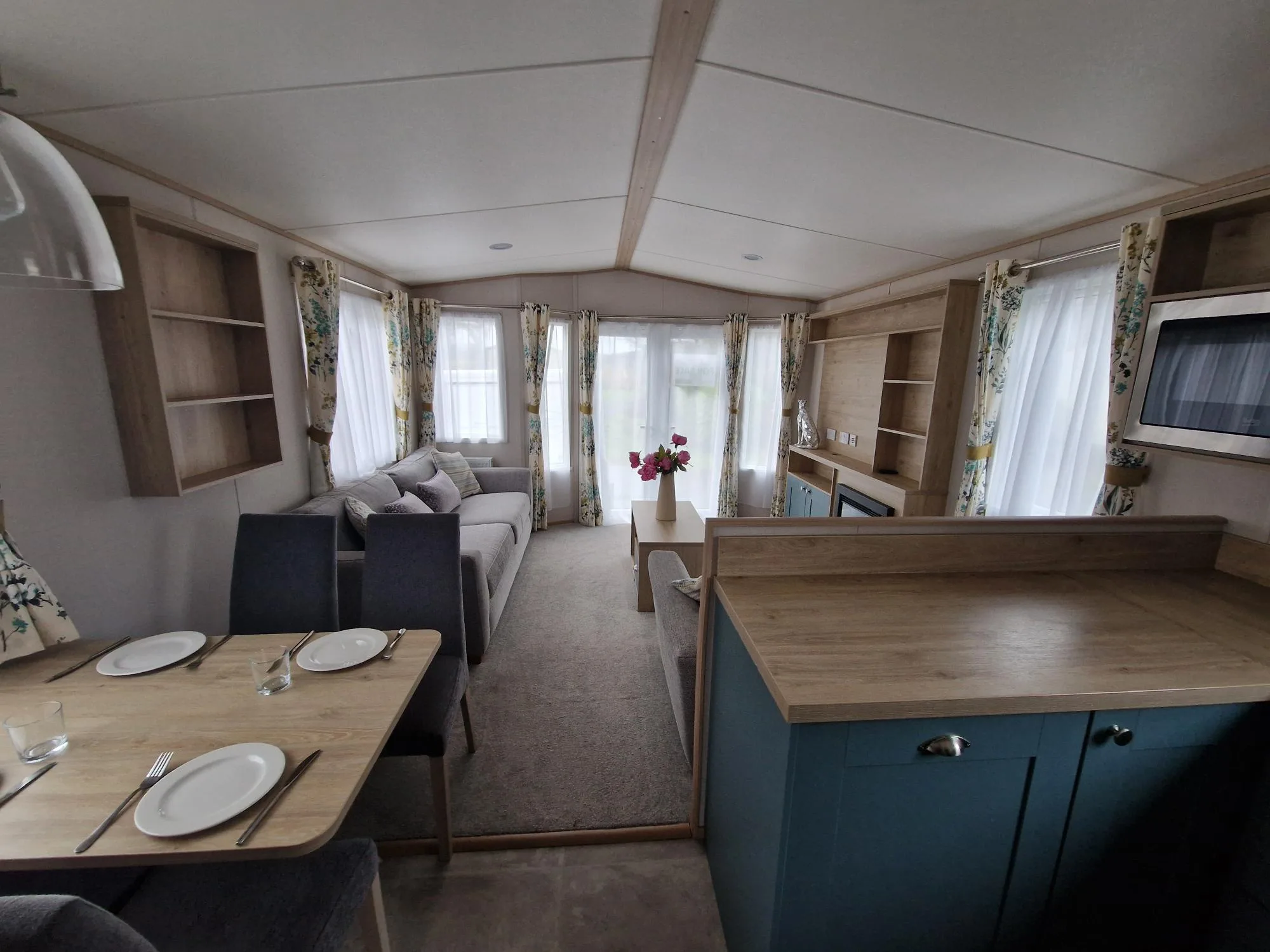The open-plan lounge and kitchen create a light, spacious atmosphere, enhanced by floor-to-ceiling patio doors that open up to breathtaking views. The lounge is a relaxing space, featuring a large sofa bed, armchair, electric fireplace, and TV unit, while the fully equipped kitchen includes integrated appliances such as a dishwasher, microwave, and fridge/freezer. A spacious dining table offers the perfect spot for family meals. The master bedroom is a serene retreat, complete with a king-size bed, generous storage, a vanity area, and an en-suite shower room. The well-proportioned twin bedroom also offers excellent storage. The family bathroom includes a modern shower, wash basin, and WC, with the added luxury of a separate en-suite in the master. The Roecliffe is the perfect combination of style, comfort, and practicality—a true home away from home.