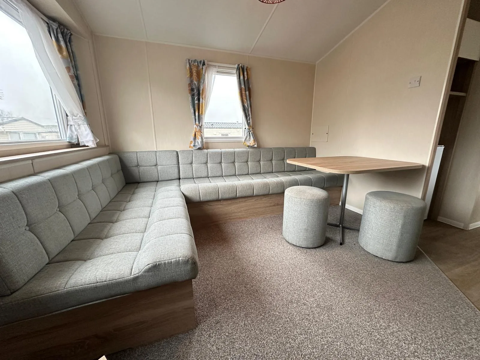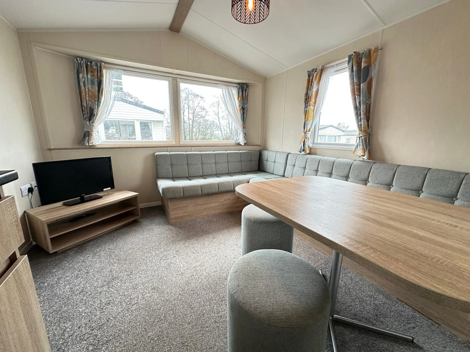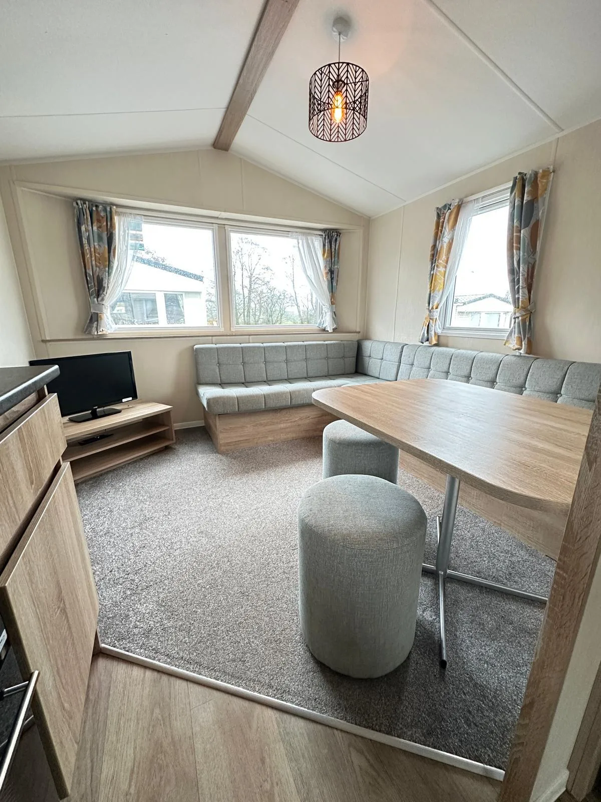 Combining modern comfort with practicality, this 2-bedroom static caravan offers everything you need for a relaxing getaway. The open-plan living area is bright and inviting, featuring a cosy L-shaped sofa with an electric fire, free-standing TV unit, and a dining area with a 4-seater table. The galley-style kitchen is fully equipped with a gas cooker, hob, and plenty of storage, including space for a fridge/freezer and microwave. The double bedroom is spacious, with an oak-effect headboard, matching bedside units, overhead shelving, and built-in wardrobe space. The twin bedroom offers great storage with a large cupboard and wall-mounted shelves. The family bathroom includes a large walk-in shower, WC, and a vanity unit with under-basin storage. Perfectly presented and packed with clever storage solutions, the Willerby Mistral is a fantastic option for families looking for a holiday home that offers both comfort and convenience. Don't miss out—enquire today!