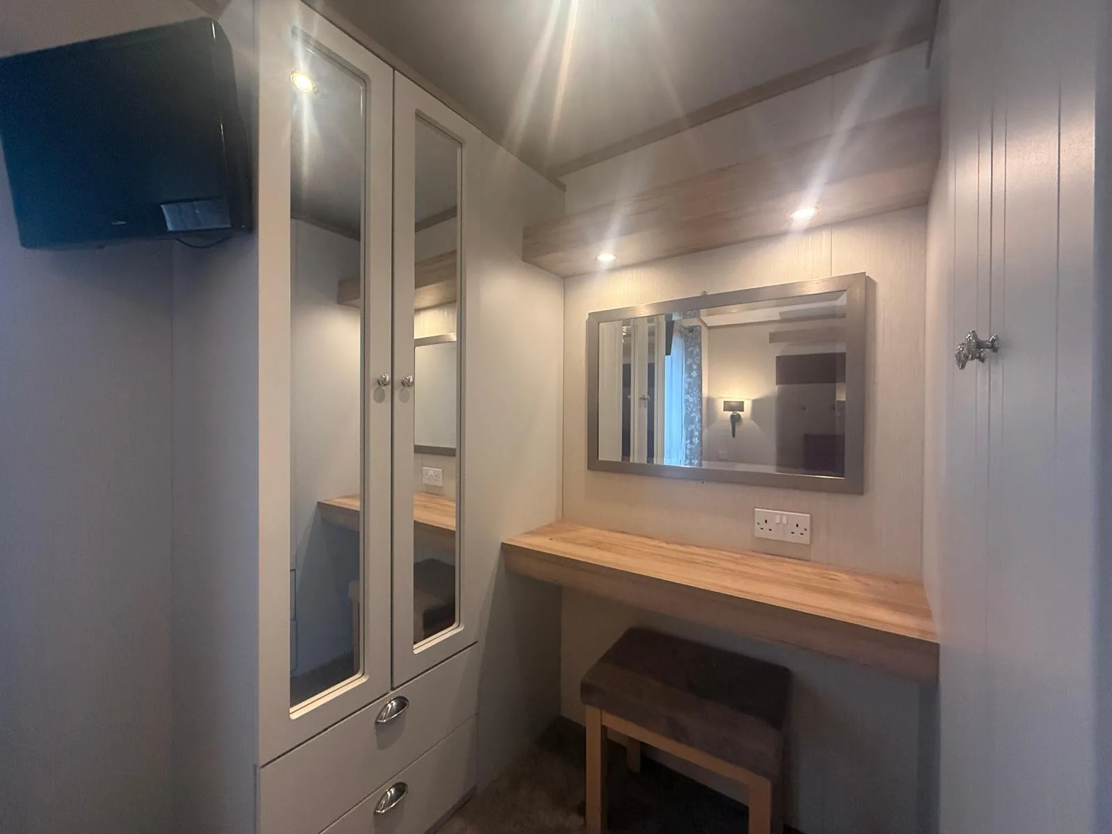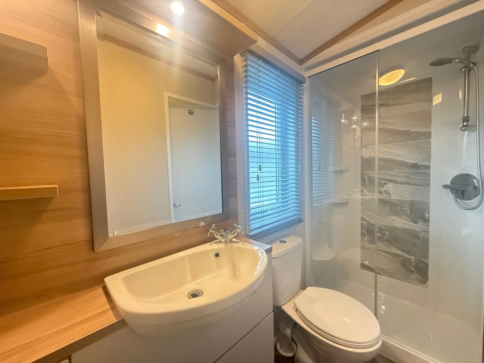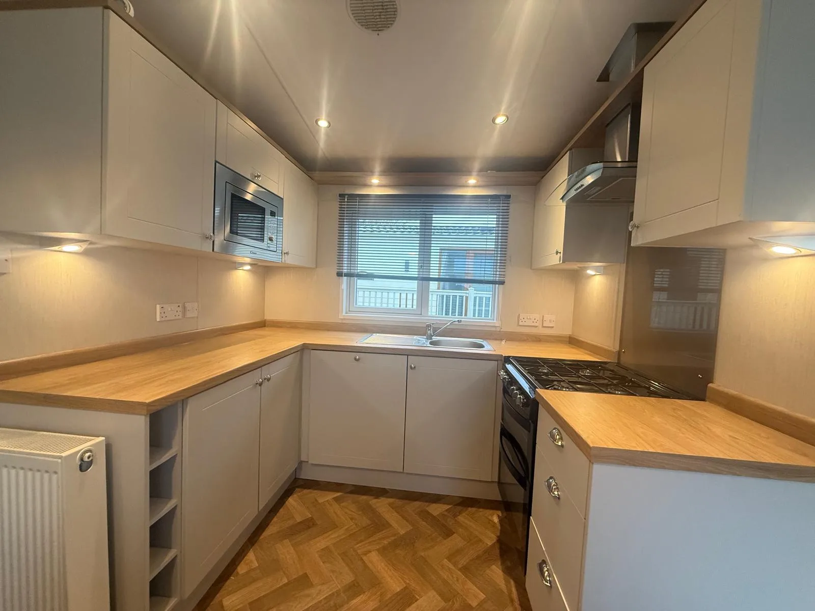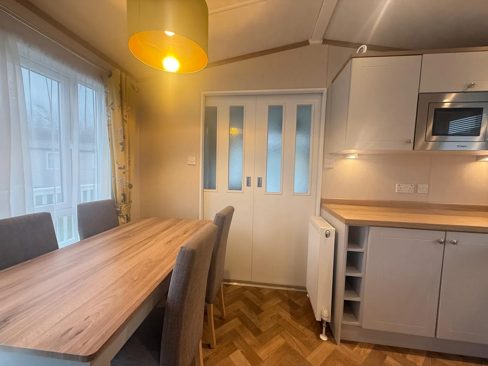 The Pemberton Abingdon is a beautifully designed two-bedroom holiday home that blends classic, traditional styling with a welcoming, homely feel. Inside you’ll find a cosy interior enhanced by bold fabrics, elegant oak accents, and a charming electric stove fireplace. French opening patio doors flood the living space with natural light, creating a seamless connection to the outdoors. The fully integrated kitchen includes a fridge/freezer and cooker, while the master bedroom offers a stylish feature wall and fitted wardrobes for comfort and practicality.