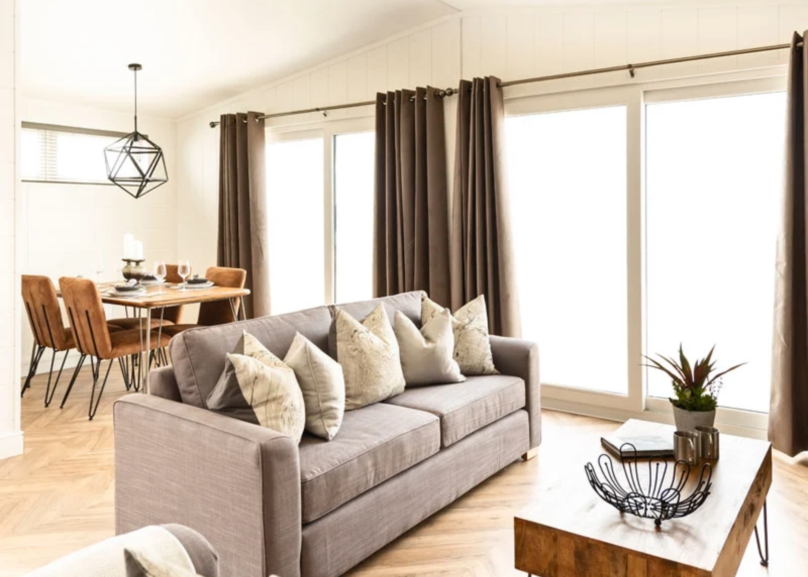 Welcome to the inviting haven of Dovecote Lodge, where comfort and luxury dance together in perfect harmony. As you step inside, the semi-vaulted ceilings and charming painted wooden feature walls envelop you in warmth and elegance. The herringbone parquet flooring underfoot adds a timeless touch of beauty to the living space. Large windows and sliding doors bathe the open-plan area in sunlight, creating a refreshing and vibrant atmosphere. Picture yourself lounging in this cosy abode, feeling the embrace of a home designed for relaxation. Dovecote Lodge not only charms with its aesthetics but also makes life easy with contract furnishings and sturdy furniture that seamlessly blends style and practicality. It's not just a holiday home; it's a retreat where you can effortlessly unwind and make lasting memories.