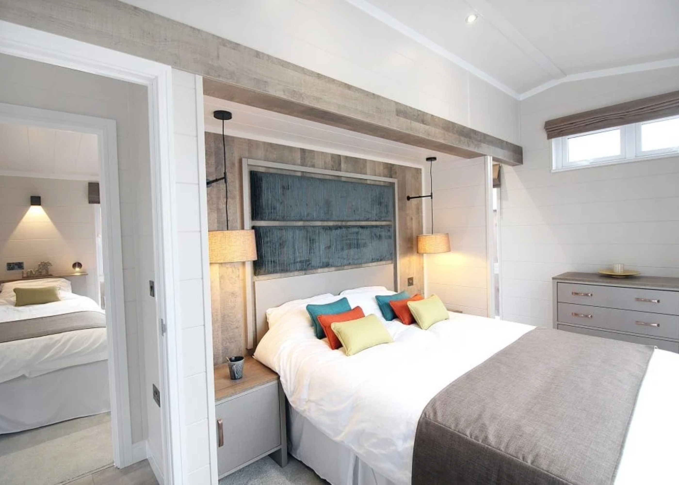 Discover The Boutique, a brand-new luxury lodge by Omar boasting innovative design features at every corner. From its front elevation with an offset roof, large boxed-out feature windows, French doors, and distinctive vertical and horizontal cladding, this lodge exudes striking and contemporary aesthetics, sure to make a statement on the park. Inside, the interior design is characterized by rustic-chic furnishings, feature walls, and a spacious window seat in the lounge, offering an ideal spot to immerse yourself in a good book or take in the view. The master bedroom stands out with its feature beam, inset feature wall, dramatic headboard, and suspension lights. It's not just the interior design that shines; an innovative layout leads to an en-suite shower room through a walk-through wardrobe. The second, third, and fourth bedrooms are equally stylish, featuring offset single/double beds with convenient shelves equipped with USB points. The family bathroom is another example of innovative styling, featuring a 'P' shaped shower-bath, and both the bathroom and en-suite come with stylish shaker-style vanity units and illuminated mirrors.