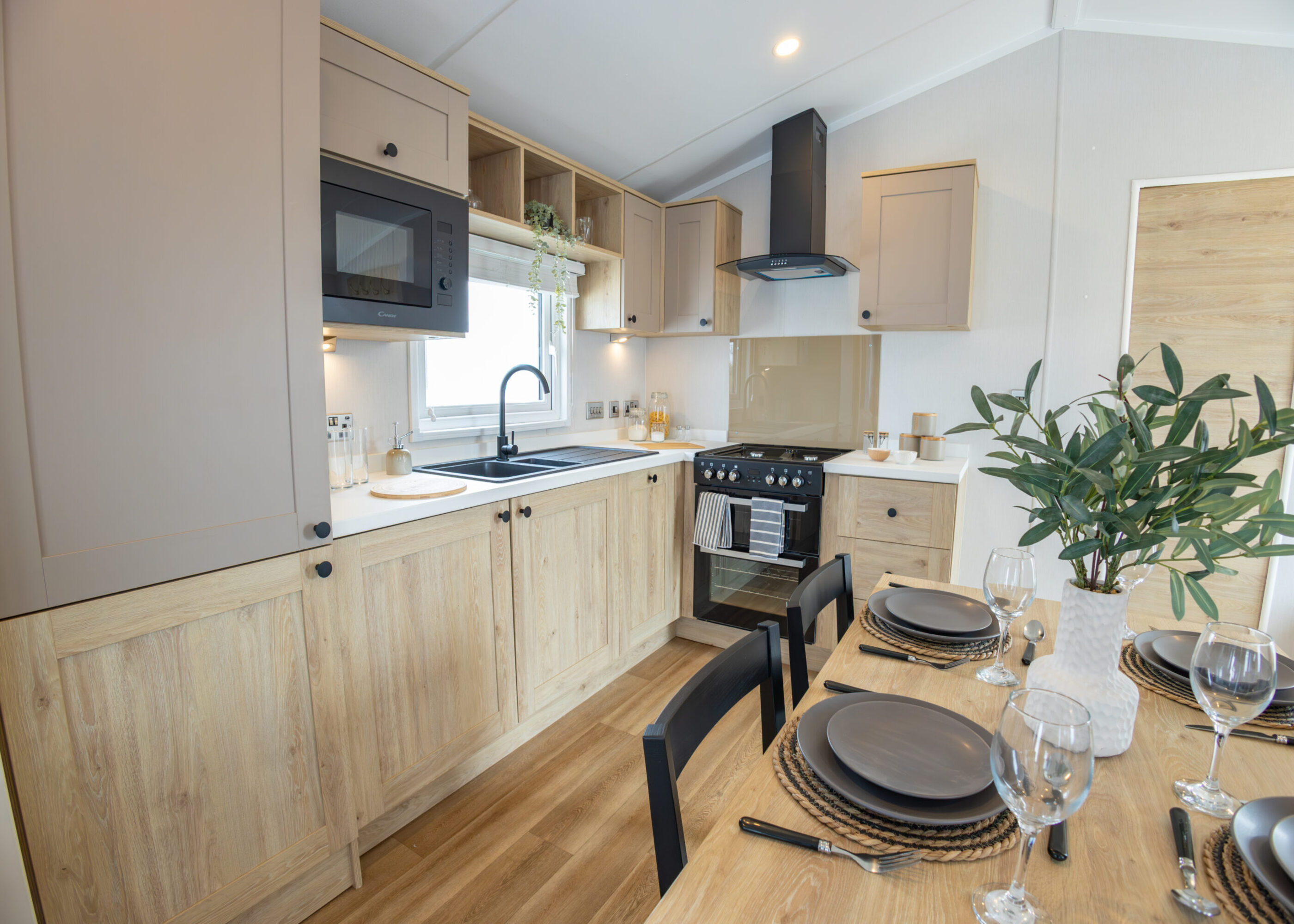 The Spirit Coastal is the perfect choice for those who appreciate modern style and everyday comfort. This elegant holiday home blends practicality with sophistication, offering everything you need for a relaxing and effortless stay. As with all Sunseeker Holiday Homes, the Spirit Coastal includes double glazing and central heating, ensuring year-round comfort whatever the weather. Inside, a soothing palette of soft coastal blues and gentle greys is paired with sleek contemporary finishes. Chic fabrics and thoughtful design touches add to the charm, creating a bright, welcoming atmosphere that feels both stylish and homely. The open-plan living area provides a comfortable space to unwind while taking in the beautiful countryside and sea views. The fully integrated kitchen is equipped with a range of modern appliances, making meal preparation simple and enjoyable. Both bedrooms have been designed with a fresh, modern aesthetic, offering a restful retreat after a day of exploring. The master bedroom features its own ensuite for added privacy, while the bathrooms include two showers for extra convenience, perfect for families or visiting guests.
