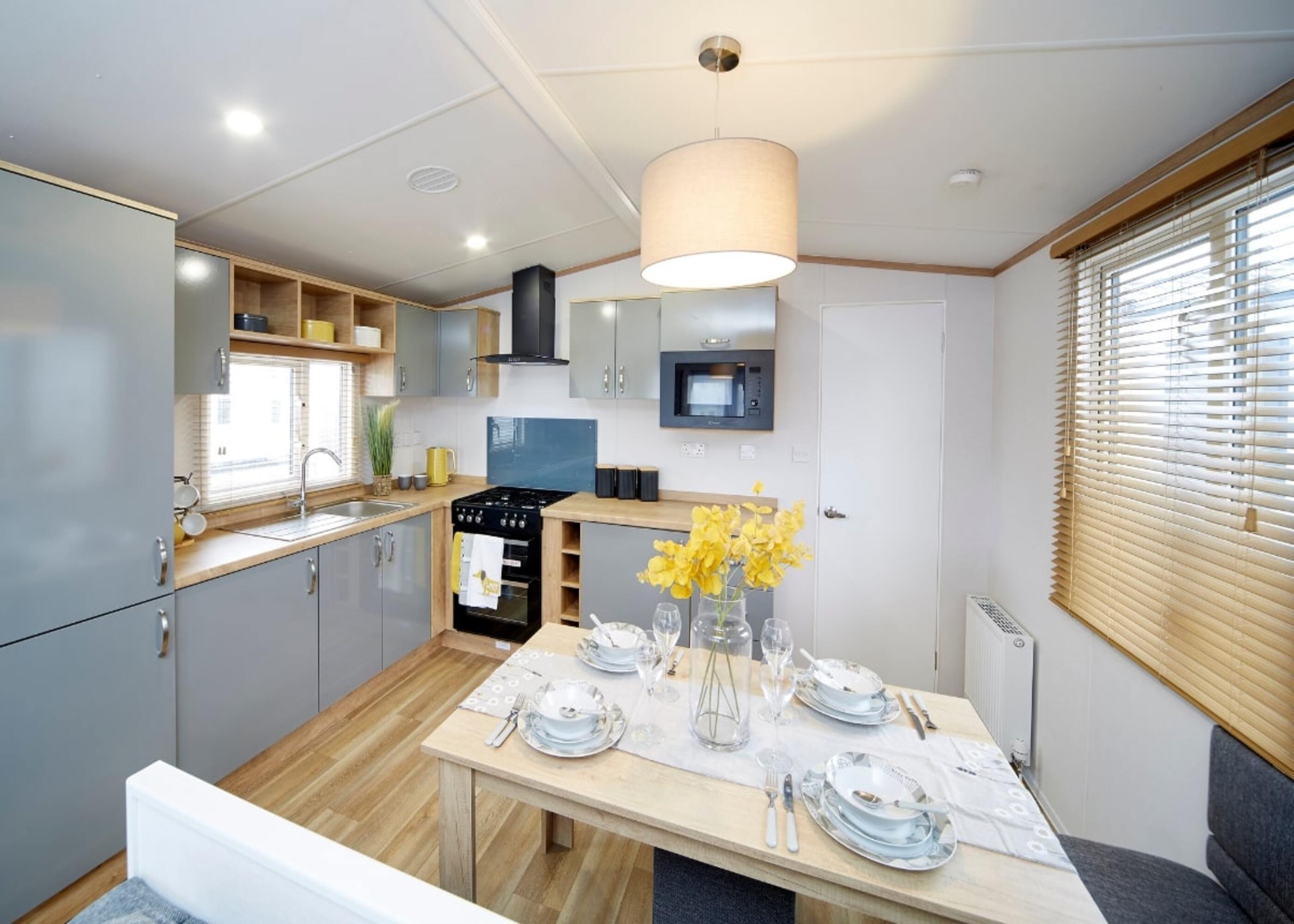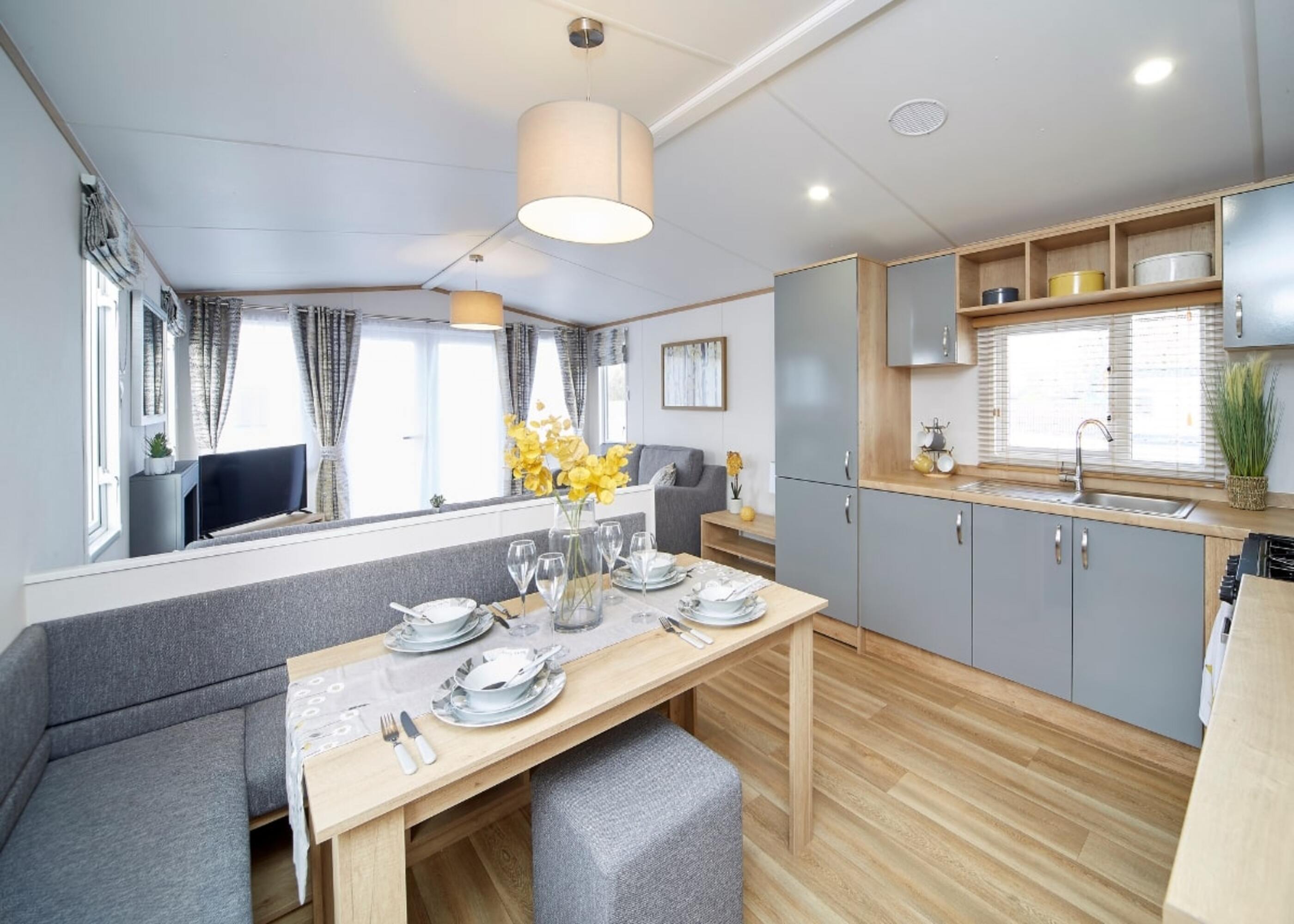 Indulge in the comforting embrace of Solis, a haven crafted for those who cherish home comforts and modern living spaces with abundant storage. Ideal for couples and families seeking a blend of rustic charm and practicality, Solis promises a contemporary interior tailored to today's holiday needs. Standard features, including Double Glazing and Central Heating, ensure a cozy and inviting atmosphere, embodying the Sunseeker commitment to quality. Solis showcases a modern and inviting blend of grey and yellow interiors, complemented by a rustic oak ambiance in its open-plan living. The well-equipped kitchen and dining area, enriched with ample storage, cater perfectly to the needs of growing families. Comfortable bedrooms and bathrooms with generous storage options complete the Solis experience. Discover the allure of Yarrow Fields, our brand new development, where these 2-bedroom lodges await your escape.
