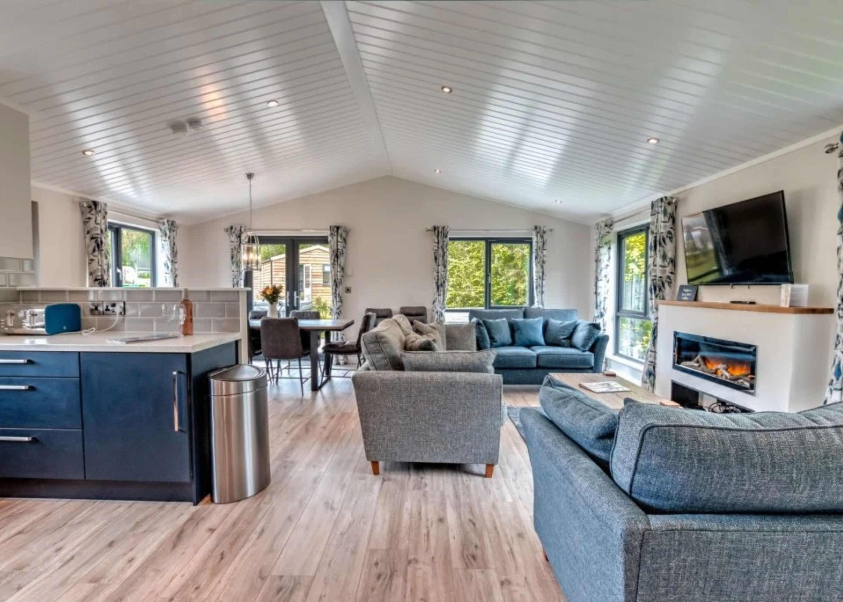 Step into the Elm Lodge at Finlake Resort and Spa, where every detail is crafted for those who cherish the holiday home lifestyle. This lodge epitomizes the ideal entertainer’s space, with its open-plan concept gracefully merging the lounge and dining areas with a meticulously equipped kitchen. The infusion of natural light through the abundant windows and French doors casts a serene glow over the lodge's warm decor, encapsulating the essence of a quintessential family retreat. From the moment you enter, the expansive living area greets you, distinguished by its soaring vaulted ceilings, inviting sofas, and an enchanting fireplace that sets the stage for cosy evenings. Adjacent, the dining space, with seating for six, extends outdoors to a generous decking area. Here, alfresco dining becomes an event, and the private hot tub beckons for moments of unrivalled relaxation against the backdrop of Finlake's breathtaking scenery. The kitchen, with its classic styling, generous worktops, and integrated modern appliances, makes cooking an absolute delight. The bedrooms offer a sanctuary of peace, each fitted with ample wardrobe space to accommodate family and holiday attire alike. At the Elm Lodge in Finlake Resort and Spa, traditional charm harmonizes with contemporary living, creating a holiday home experience that invites you to indulge in every season.