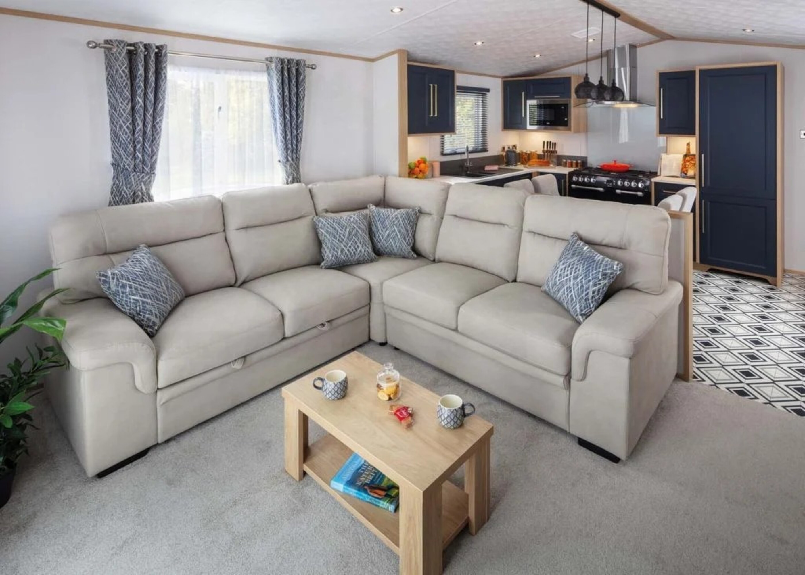 Discover serenity on a lovely south-facing plot at Foxes Walk. This 3-bedroom Chantry lodge, a 2023 model, awaits your personal touch. Complete with oversized sun decking and a brand new Hydropool Hot Tub, it's a haven of luxury just arrived and ready to be placed on your chosen spot. Step into elegance as the Chantry Lodge welcomes you with a lounge adorned in contemporary blue and cream soft furnishings. Large patio doors flood the space with natural light, while a grand sofa, doubling as a pull-out bed, offers comfort. The entertainment unit boasts a stunning glass-fronted fire and accommodates a 55” TV. The kitchen is a show-stopper with luxury indigo doors, gold effect handles, glass splashback, marble effect worktops, and a stylish grey resin sink. The dining area, featuring a table with deep grey legs and plush high back chairs, is illuminated by three pendant lights embracing a gold theme. The master bedroom is a retreat of its own with a spacious en suite shower room boasting a beautiful geometric tiled floor. The family bathroom mirrors this elegance with a large sink for that comforting touch of home. If you crave space, luxury, and the allure of a show-home interior, the Chantry Lodge is your ideal match. Seize the opportunity to turn this haven into your personalized retreat of relaxation and style.
