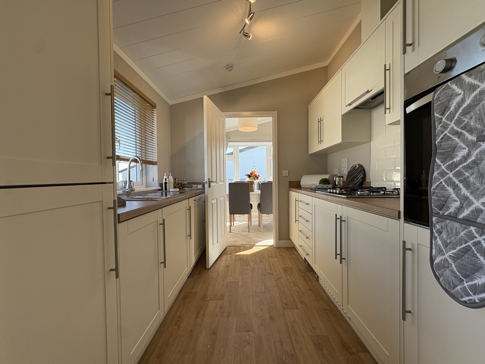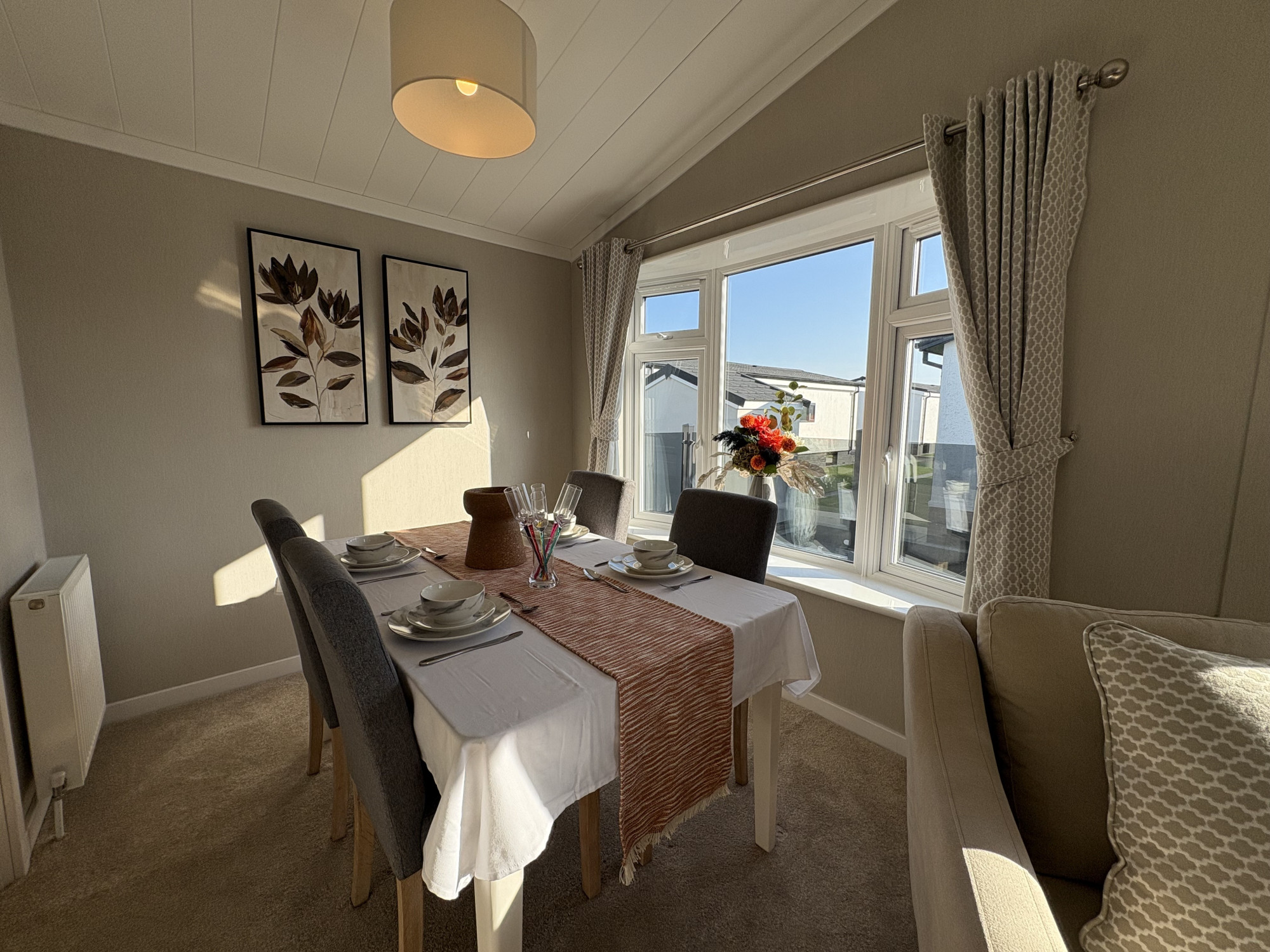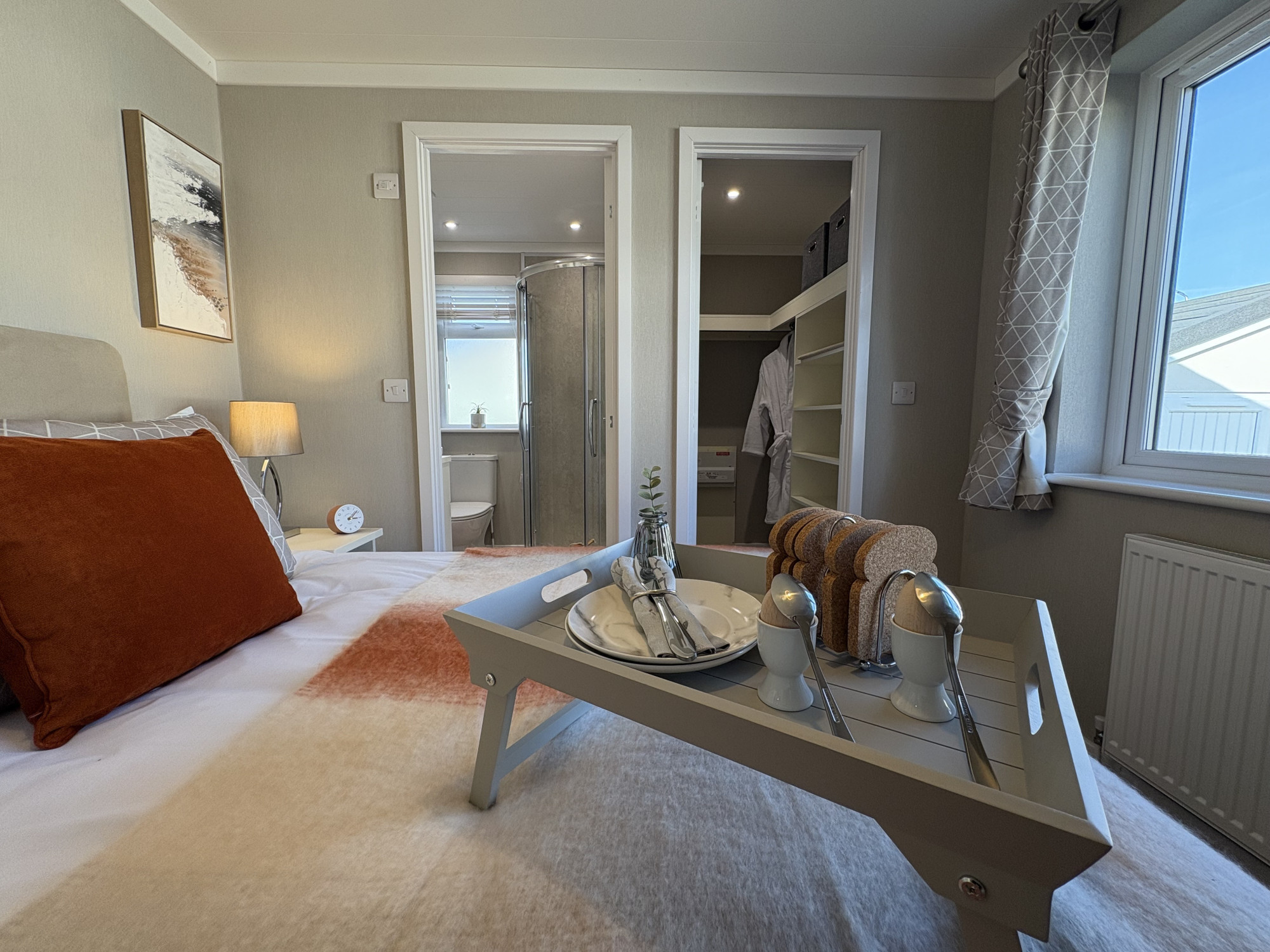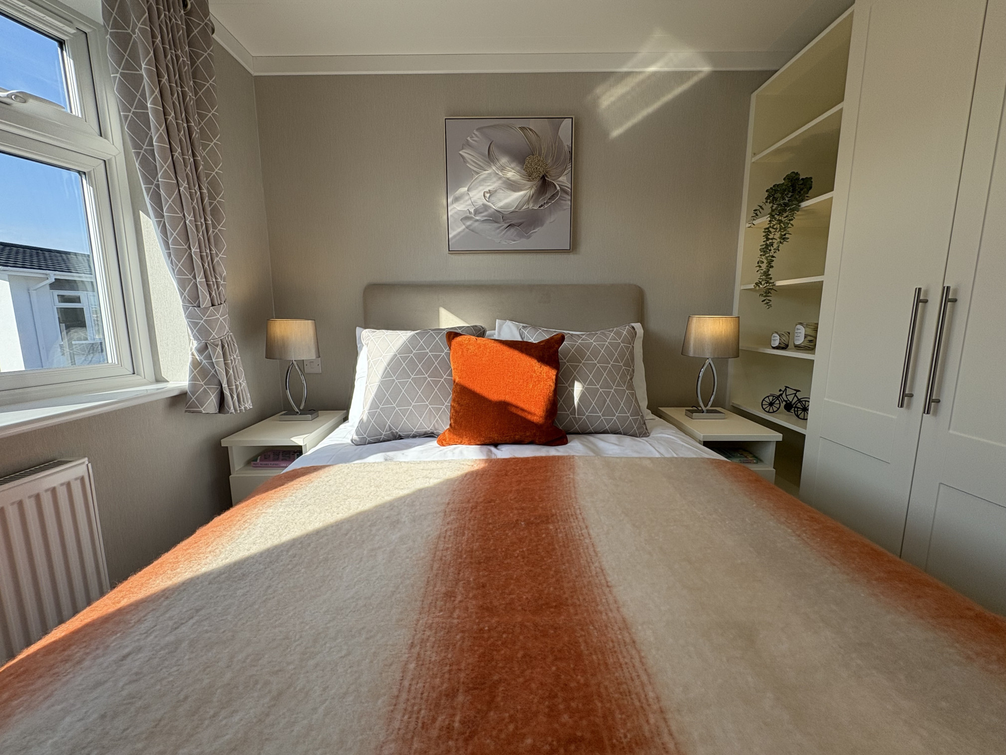 This brand new, modern-furnished Omar Middleton park home (40\'x20\') is perfect for those looking for a detached, easy to maintain, bungalow-style property. The home features comfortable open plan kitchen and dining area, and a comfortable living room with large windows. There are two double bedrooms, an en suite and a bathroom.