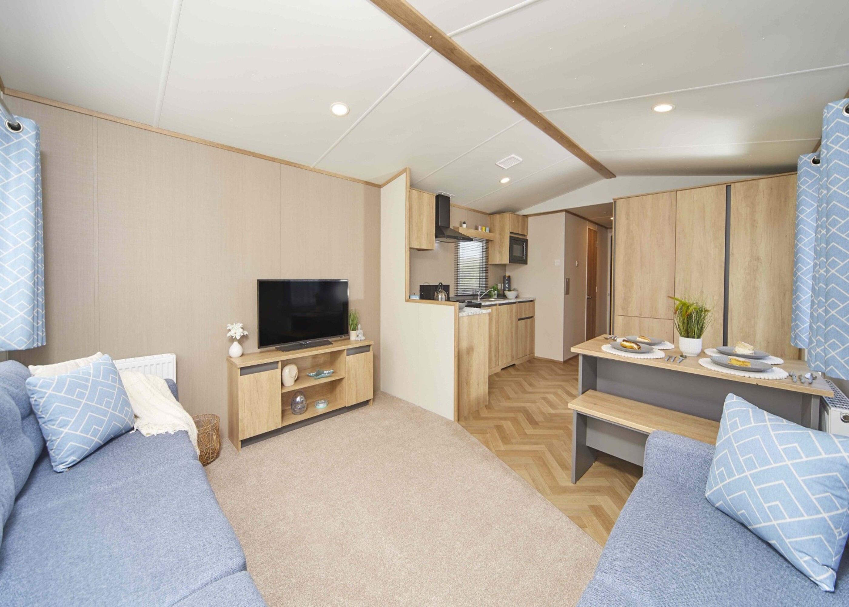The Breakaway is a stylish and luxurious holiday home created with comfort and ease in mind, set within a calm and welcoming area of the park. Featuring the much-loved Carnaby Comfort specification, this home includes generous seating, a modern and well-equipped kitchen, and striking vaulted ceilings that give the interior a bright, open feel. With three bedrooms, it’s perfectly suited to family escapes or hosting guests in relaxed comfort. The spacious open-plan lounge forms the heart of the home, offering a wraparound fixed sofa with coordinating cushions, built-in USB charging points, and a dining table with bench seating. It’s a versatile space designed for socialising, relaxing, and enjoying quality time together throughout your stay. Located on plot CR29, this holiday home benefits from a private driveway, brand-new decking, and a peaceful position within the park. A perfect base for unwinding outdoors and enjoying effortless holiday living in a quiet, well-placed setting. With three inviting bedrooms and three stylish bathrooms, the Carrington provides comfort, ease and privacy for all. At Crugan Holiday Park, you’ll also enjoy full access to its sister park, The Warren Resort & Spa, where you can take a dip in the indoor or heated outdoor pool, unwind in the tranquil spa, or stroll down to the private beach just moments away.