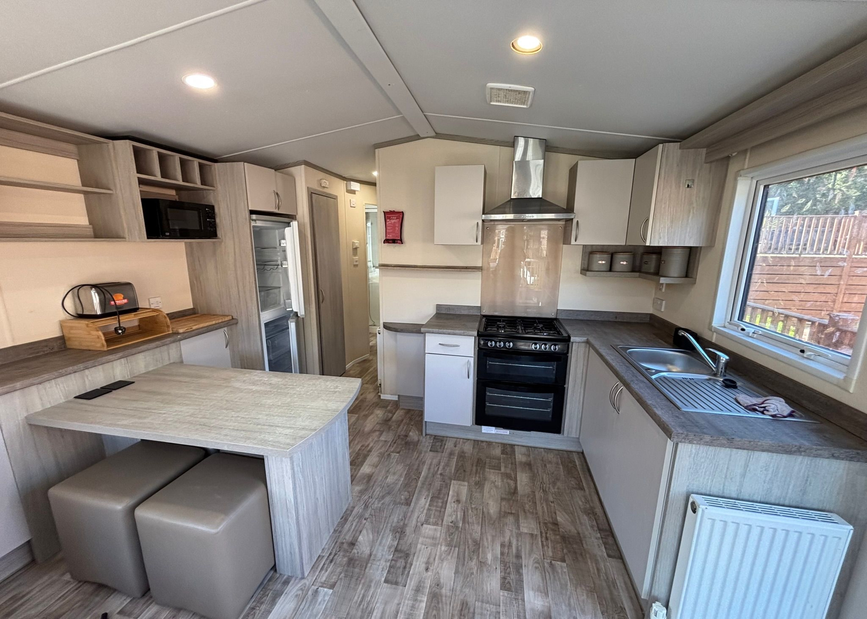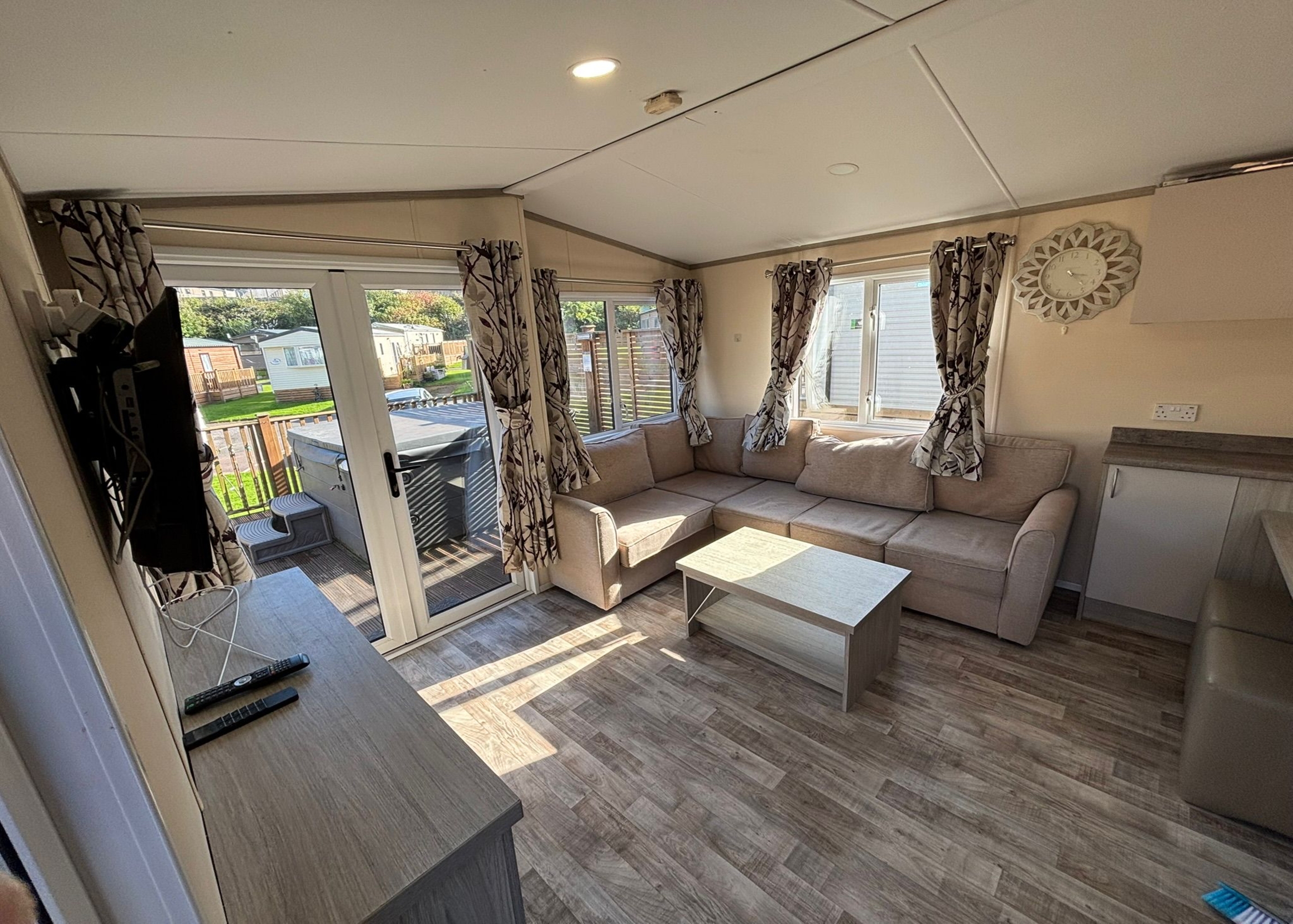 Welcome to Regal Seascape, a well-presented pre-loved holiday home set within a calm countryside environment, perfectly situated on an entrance-level plot close to the park’s facilities for effortless access and everyday convenience. The heart of the home is a bright and comfortable lounge, designed to suit both relaxing and social occasions. Wide windows and patio doors fill the space with natural light and open directly onto the decked outdoor area, offering an ideal setting to enjoy the outdoors or unwind in your private hot tub. Subtle ambient lighting and a premium Bluetooth entertainment system enhance the atmosphere, creating a space that works equally well for quiet evenings or entertaining guests. The lounge flows seamlessly into the kitchen, where modern cabinetry in soft neutral tones provides a stylish yet practical space, fully equipped to make meal preparation easy and enjoyable. The Seascape offers two inviting bedrooms, including a spacious master bedroom complete with its own private ensuite bathroom, delivering added comfort and privacy. The second bedroom is equally welcoming, making the home suitable for couples, families, or visiting friends. Elegant, practical, and thoughtfully arranged, Regal Seascape brings together contemporary comforts and a peaceful setting, offering a delightful retreat in this beautiful countryside location.